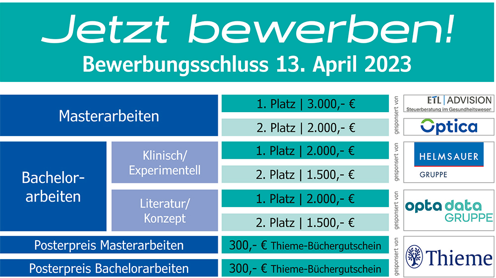 Der erste Platz in der Kategorie Masterarbeit wird mit 3.000 Euro Preisgeld prämiert (gesponsort von ETL Advision), der zweite Platz mit 2.000 Euro (gesponsort von Optica). In den Kategorien der Bachelorarbeiten erhalten die Erstplatzierten jeweils 2.000 Euro und die Zweitplatzierten jeweils 1.500 Euro Prämie (gesponsort von der Helmsauer Gruppe bzw. opta data). Zusätzlich wird jeweils ein Posterpreis für Bachelor- und Masterarbeiten vergeben. Die Gewinner erhalten einen Büchergutschein vom Thieme-Verlag in Höhe von 300 Euro.