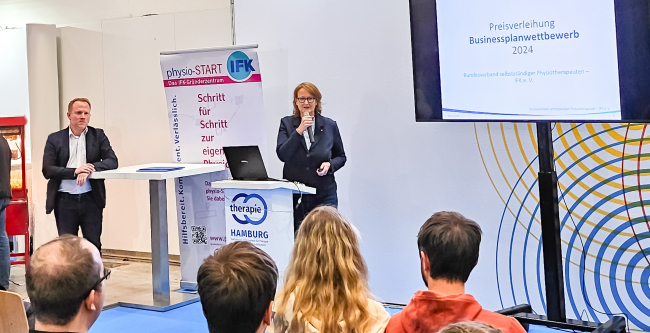 Der erste Platz ging in diesem Jahr an Finja Jodies für ihren Businessplan mit dem Titel „Kinderphysiotherapie ‚MiniFit Trittau‘“. Der mit 5.000 Euro dotierte Preis wurde von der stellvertretenden Vorstandsvorsitzenden des IFK, Brigitte Heine-Goldammer, überreicht. Der zweite Platz mit einem Preisgeld von 2.500 Euro ging an Celina Vieregge für ihren Businessplan „Bauchgefühl. Private Physiotherapie in und nach der Schwangerschaft“. In ihrer Rede würdigte Heine-Goldammer den Ideenreichtum und Gestaltungswillen der beiden Preisträgerinnen.