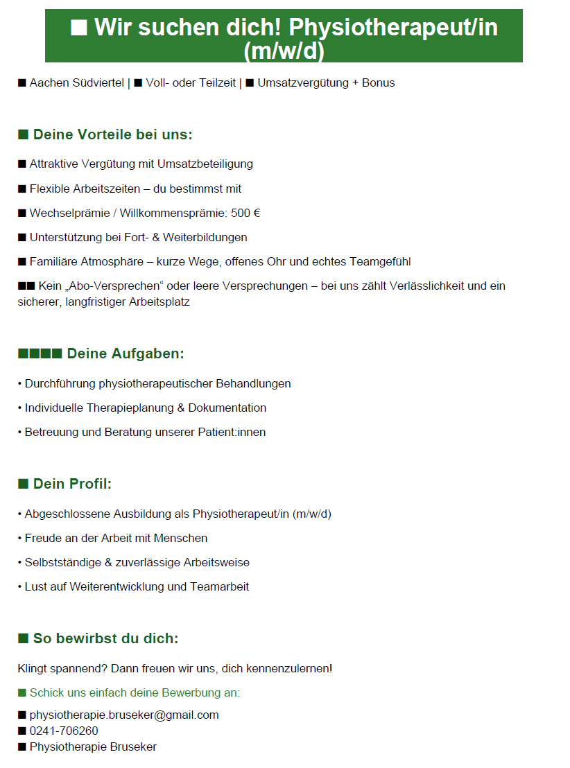 10.09.2025 Physiotherapie Bruseker Aachen Südviertel Deutschland Telefon 0241 706260 E-Mail physiotherapie.bruseker@gmail.com Physiotherapie Bruseker Aachen Südviertel